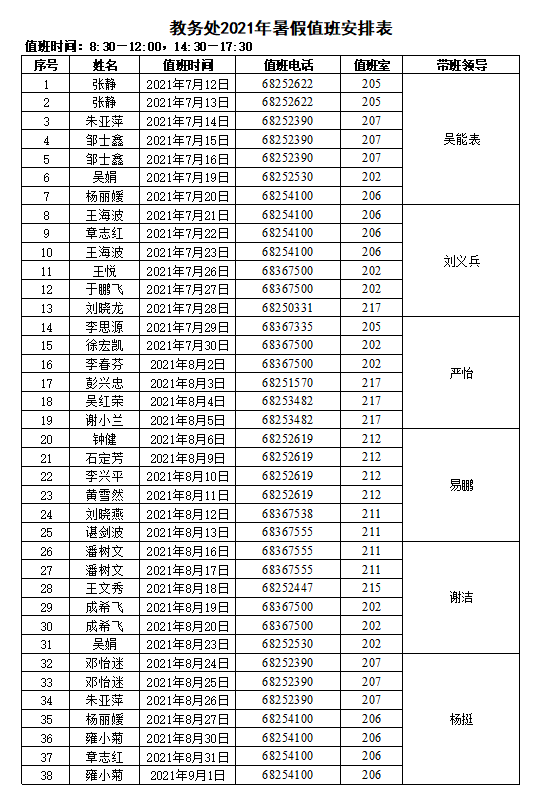 教务处2021年暑假值班安排表