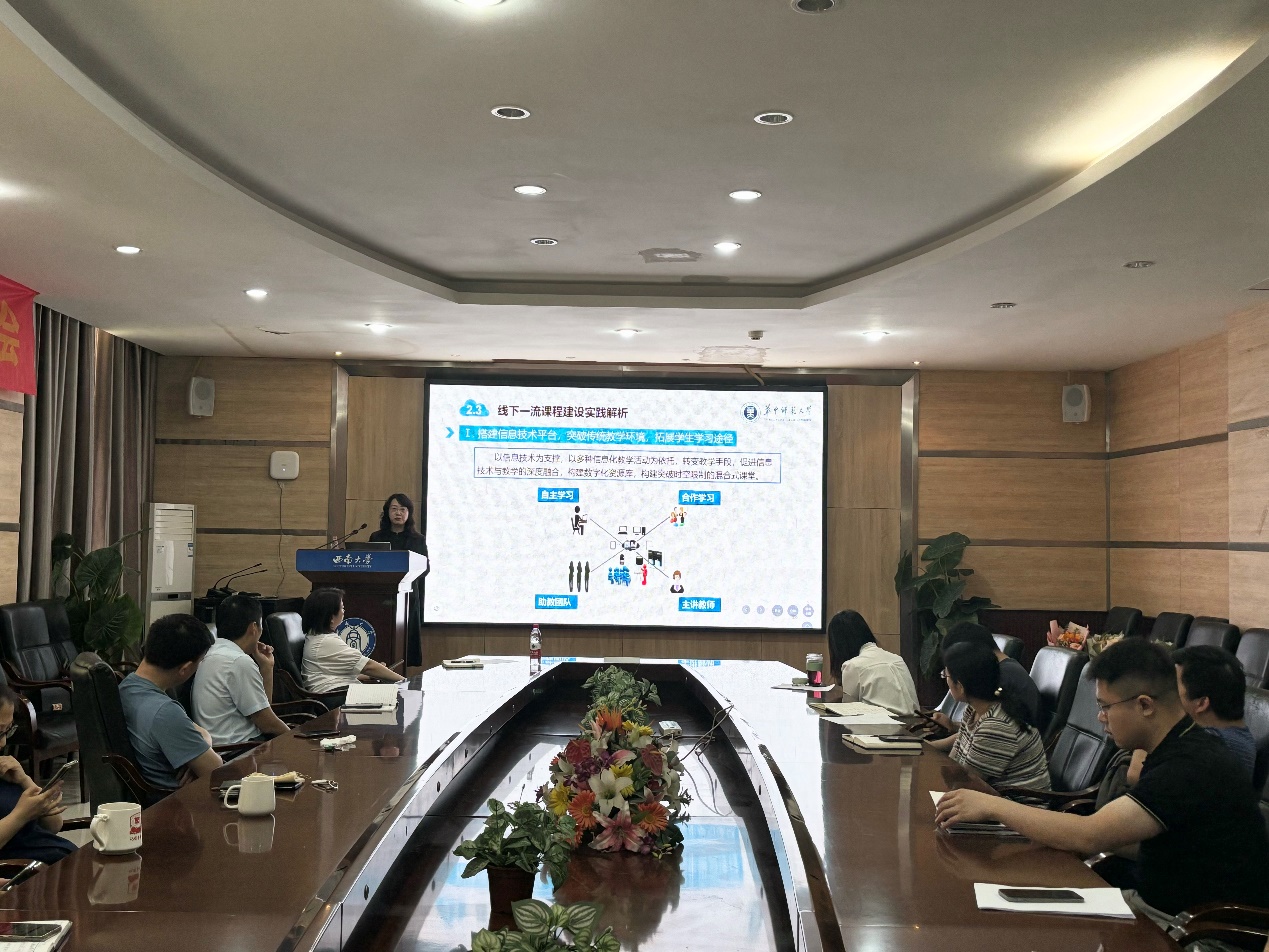 建一流课程,育优秀人才。李睿教授指出,一流课程是一流专业、一流本科建设的基础,这是一项系统工程,要以“两性一度”为指南,建立“学生为中心、数据为驱动、成果为导向”的教学目标,坚持以德立身、以德立教和以德施教,培养高端应用型人才。首先,优质的课程设计是打造金课的基础,课程设计应以学生为中心,因材施教。一门好的课程,必定包括精心的内容设计、课程规划和课后答疑,每一节课都应当尽量让学生有所学,有所悟,有所得。其次,金课打造应重视现代信息技术与教学的深度融合。在课程建设中,要善于整合现有资源,聚焦课程重点,突出理念创新,合理应用现代教学技术,以解决教学中的“痛点”问题,全面提升人才培养质量。最后,李睿教授同学院老师就当前线下一流课程建设实践进行了充分的交流探讨。唐梅主任提到,我们要以工科切准时代脉搏,用融合拓宽课程场域,在线下一流课程的打造过程中,要发挥多学科交叉融合的联动作用,要以更加积极和包容的心态走出去,用充分的专业交流拓宽建设视野和专业资源,用大范围的调研学习弥补面对新挑战的经验缺失。