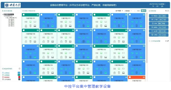 31教智慧教室能通过集中管理的中控平台管理全部教学设备,实现教学设备的锁定及自动开关机。管理端设置多媒体设备管理办公室1间,管理人员3名,课表时段全覆盖安排人员值班,做好设备运行的管理,为师生提供全方位的服务。