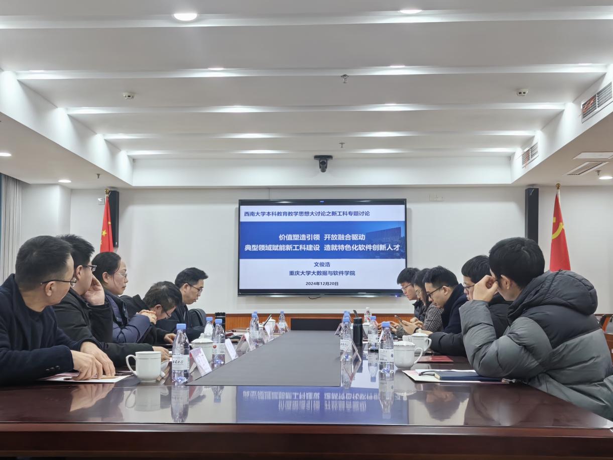 2024 年 12 月 20 日下午,为响应学校本科生院的相关要求,人工智能学院在出版社大楼 2001 会议室,成功举办了本科教育教学思想大讨论之新工科专题讨论会。此次会议汇聚了众多教育领域的专家与学者,重庆大学大数据与软件学院党委书记文俊浩、重庆大学国家卓越工程师学院执行院长罗远新、PA视讯本科生院教学质量监控与评估中心主任陶丽,以及各工科相关二级学院分管本科教学工作的副院长和教师代表们齐聚一堂,共同探讨新工科教育的发展方向与改革路径。会议由人工智能学院副院长陈枫教授主持。
