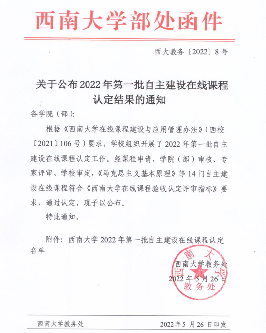 关于公布2022第一批自主建设在线课程认定结果的通知(西大教务〔2022〕8号).pdf