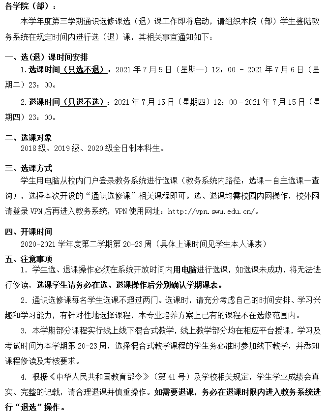 关于开展2020-2021学年度第三学期通识选修课选(退)课的通知