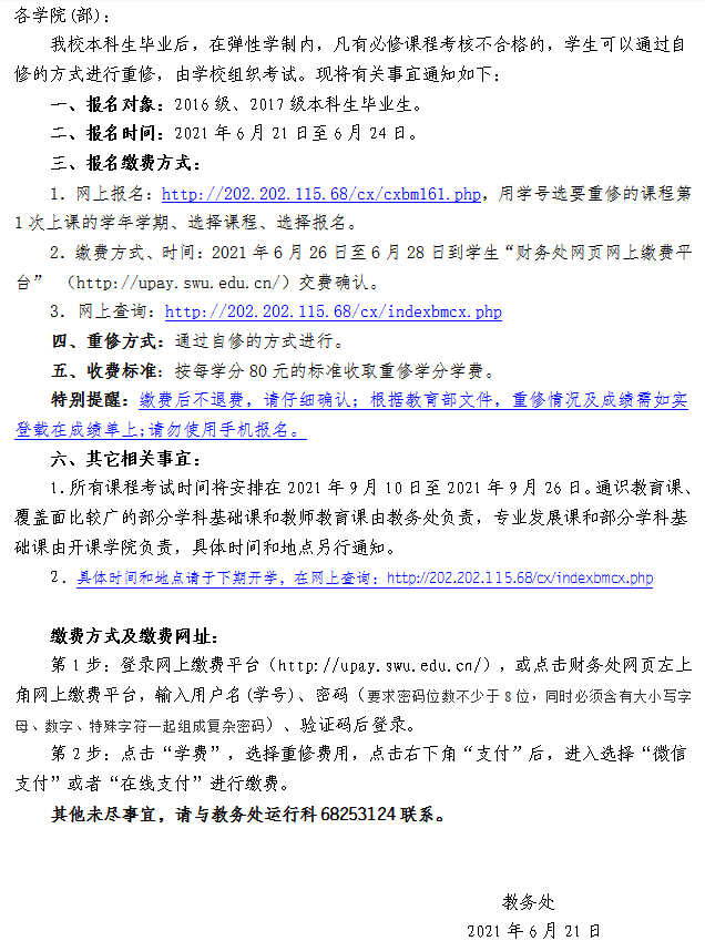 关于组织2016级、2017级毕业生毕业后课程重修及考试的通知