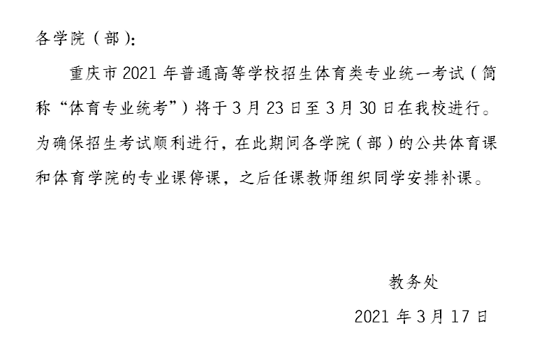 关于重庆市2021年“体育专业统考”期间体育课停课的通知