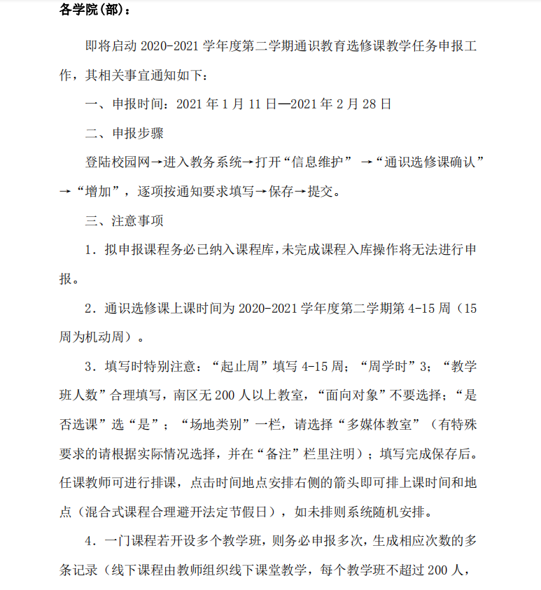 关于申报2020-2021学年度第二学期通识教育选修课教学任务的通知