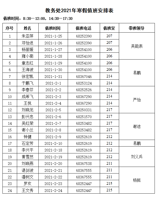教务处2021年寒假值班安排