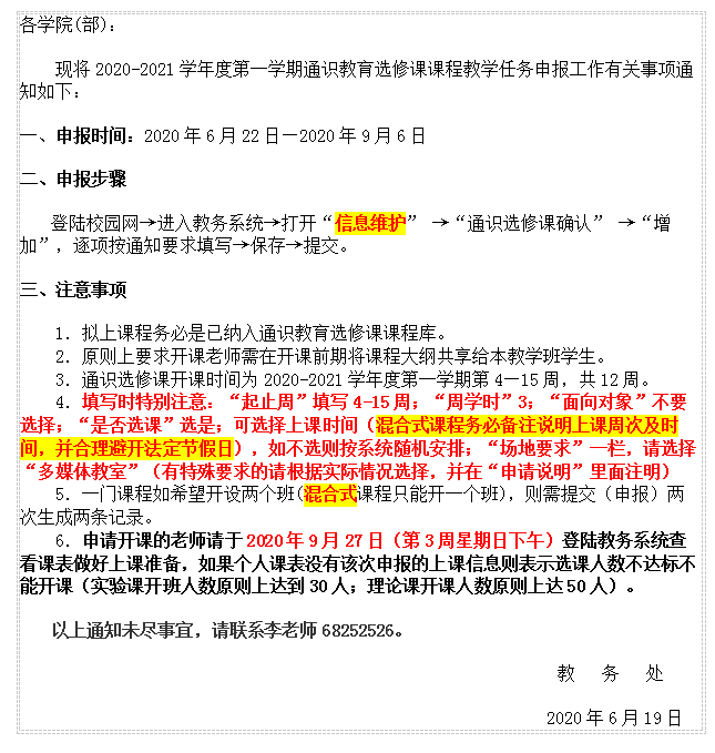 关于申报2020-2021学年度第一学期通识教育选修课教学任务的通知