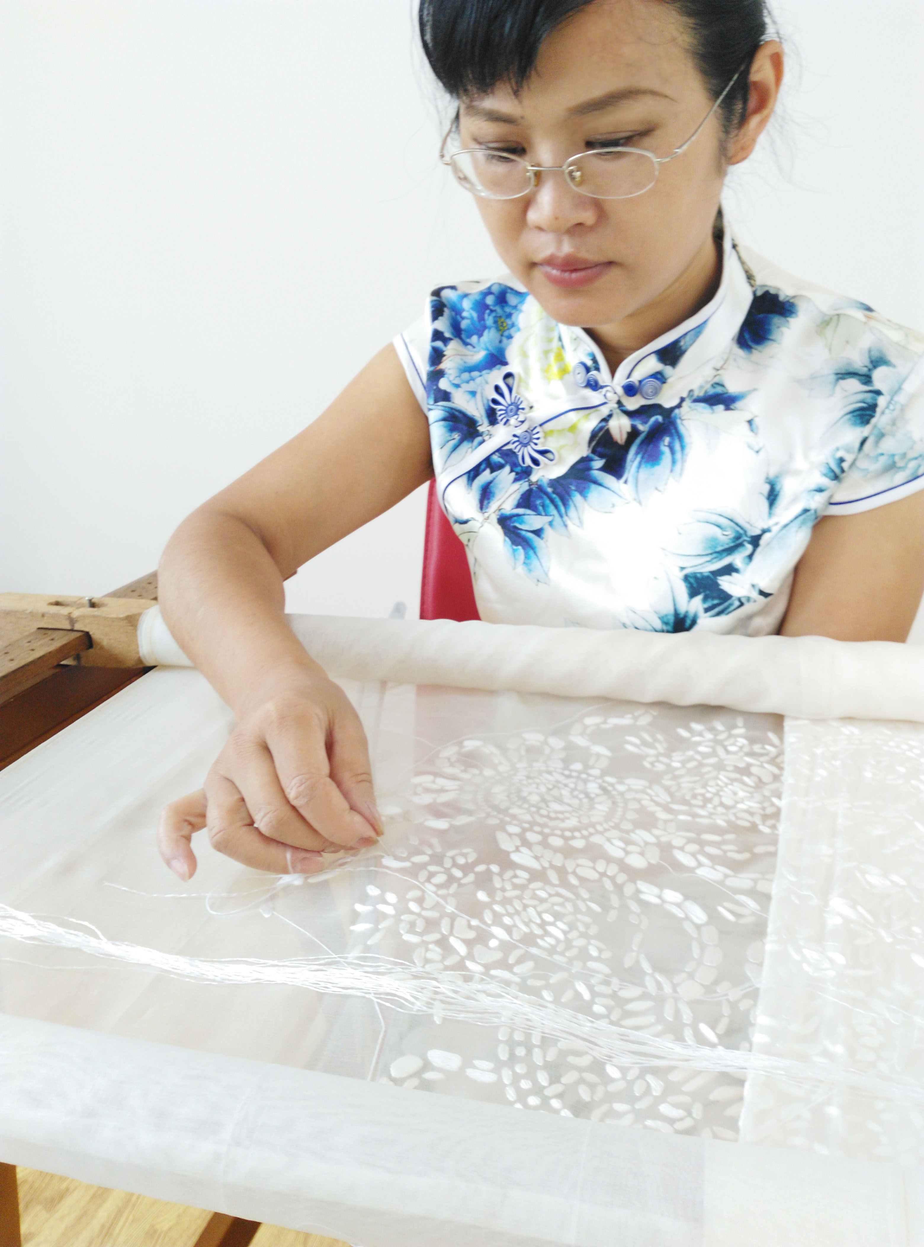 肖华,四川省工艺美术大师,四川省民间艺术(刺绣工艺)大师,成都市非遗代表性传承人。熟练掌握了蜀绣针法技艺,能进行蜀绣的单面绣、双面绣,以及异色、异形、异针“三异绣”的绣制。