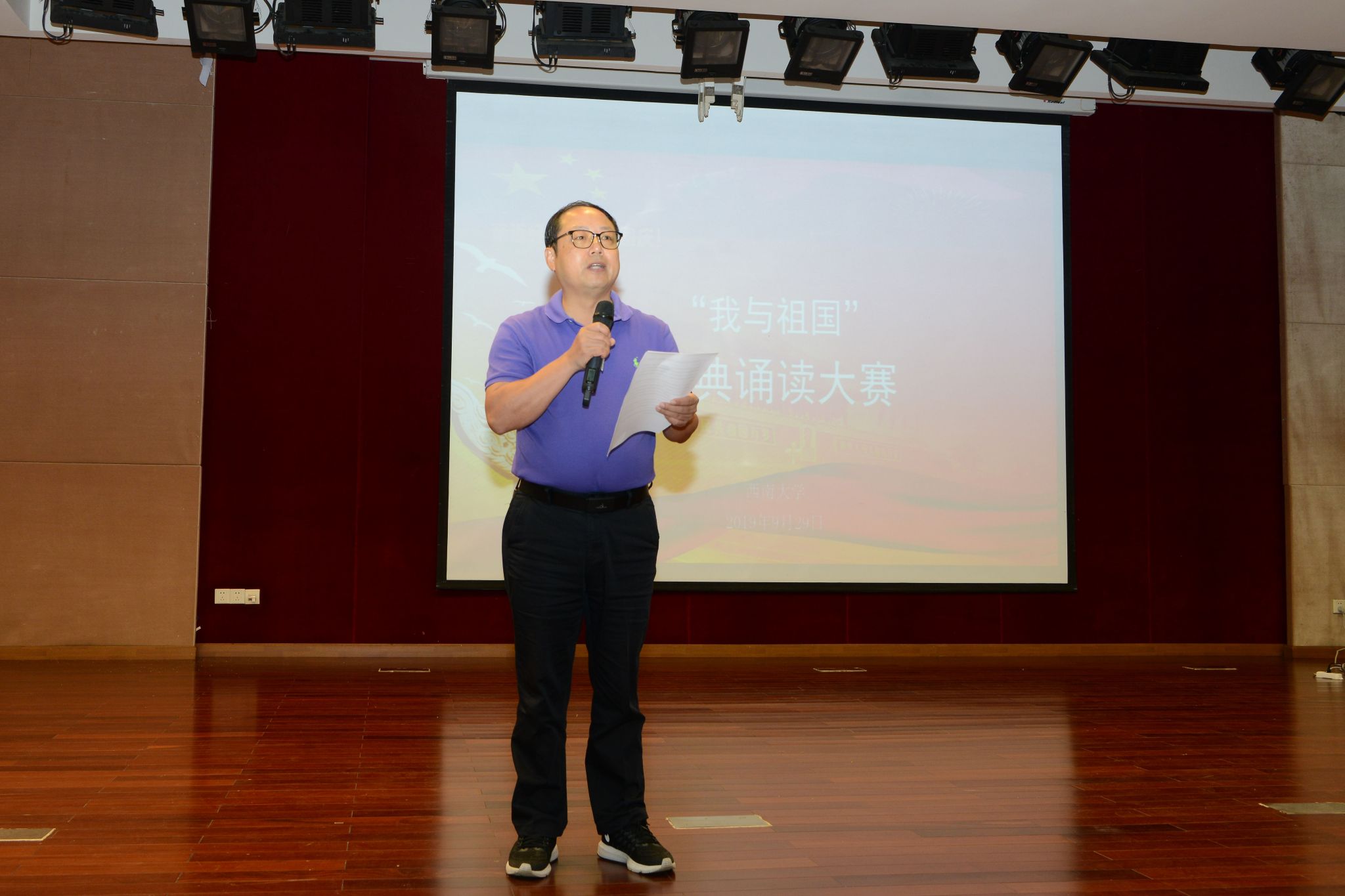 校长助理周光明首先向大会致辞。他对“亲近经典,献礼国庆”的经典诵读竞赛主题做了精到的解读,对同学们学习、传承中华优秀传统文化的自觉行动表示了肯定,对青年学子献礼祖国七十华诞的满腔热情表达了赞许。最后,周光明助理祝福祖国母亲七十岁生日快乐,并宣布“我与祖国”经典诵读大赛开幕。