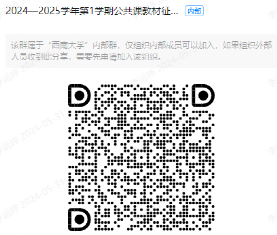 2.本次公共课教材征订计划仅统计2024—2025学年第一学期所需且尚未征订的公共课教材,请通过“趣选书”平台完成相关工作,具体工作方案将在“本科公共课教材征订”钉钉群通知(请相关学院负责公共课教材征订的教师加入钉钉工作群,此前已加群的请忽略,请用钉钉扫二维码加群)。