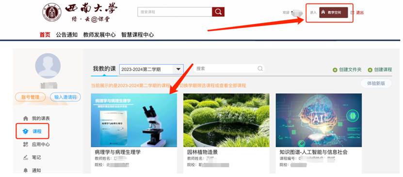 进入“教学空间”,点击左侧“课程”(若新学期首次建课,需先点击课程激活),选择要发起直播对应的课程并进入。