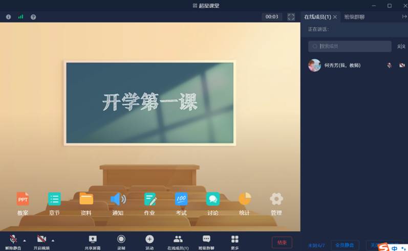 教师可以进行音视频互动、共享屏幕,同时可以结合课堂活动及课程资源进行教学。