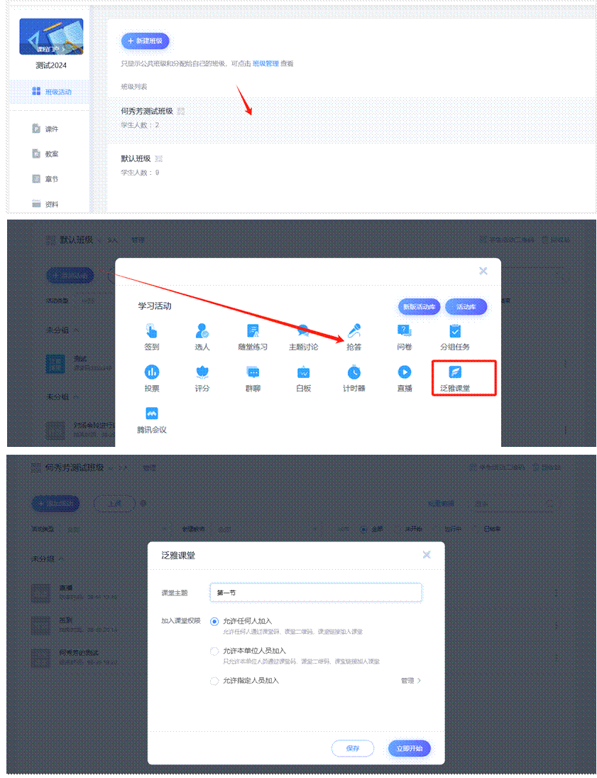 进入班级—添加活动—泛雅课堂—输入课堂名称,点击立即开始。