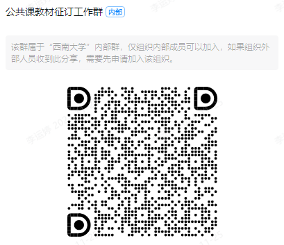 2.本次公共课教材征订计划仅统计2024—2025学年第二学期所需且尚未征订的公共课教材,请通过“趣选书”平台完成相关工作,具体工作将在“本科公共课教材征订”钉钉群通知(请相关学院负责公共课教材征订的工作人员加入钉钉工作群,此前已加群的请忽略,请用钉钉扫二维码加群)。