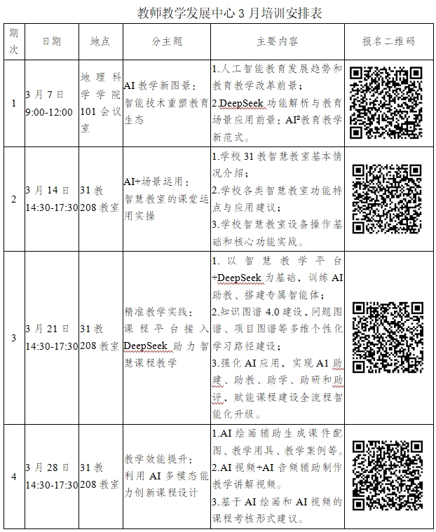 为贯彻落实教育部人工智能赋能教育行动方案,适应以DeepSeek为代表的智能教学技术发展需求,提升教师AI教育教学使用和智慧教室场景应用能力,经研究,拟开展“AI智能教学能力提升”专题培训。具体方案如下: