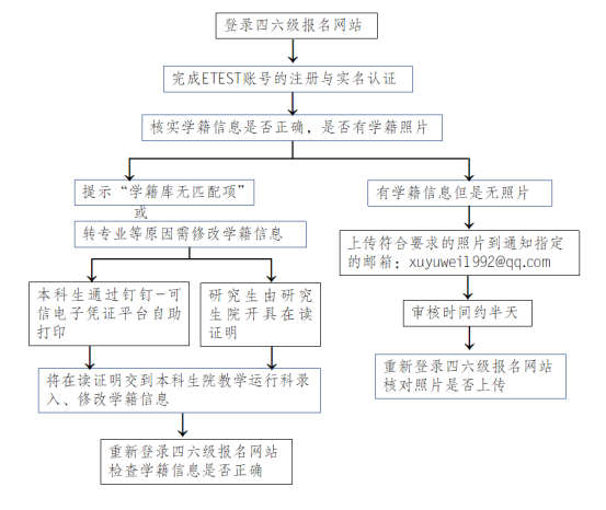 若在报名网站(http://cet-bm.neea.edu.cn/)中查询提示无匹配学籍,则需提供在读证明到本科生院教学运行科录入学籍信息,在报名网站上能查到学籍信息后再前将照片发送到邮箱:xuyuwei1992@qq.com,否则上传照片无效。