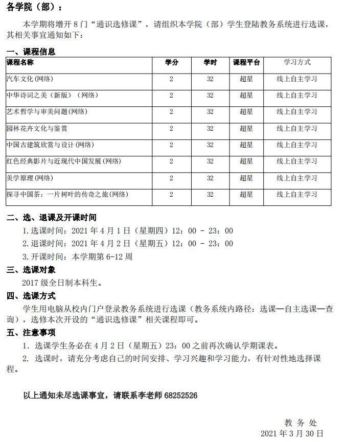 关于开展本学期增开“通识选修课”课程选课的通知