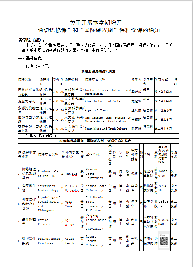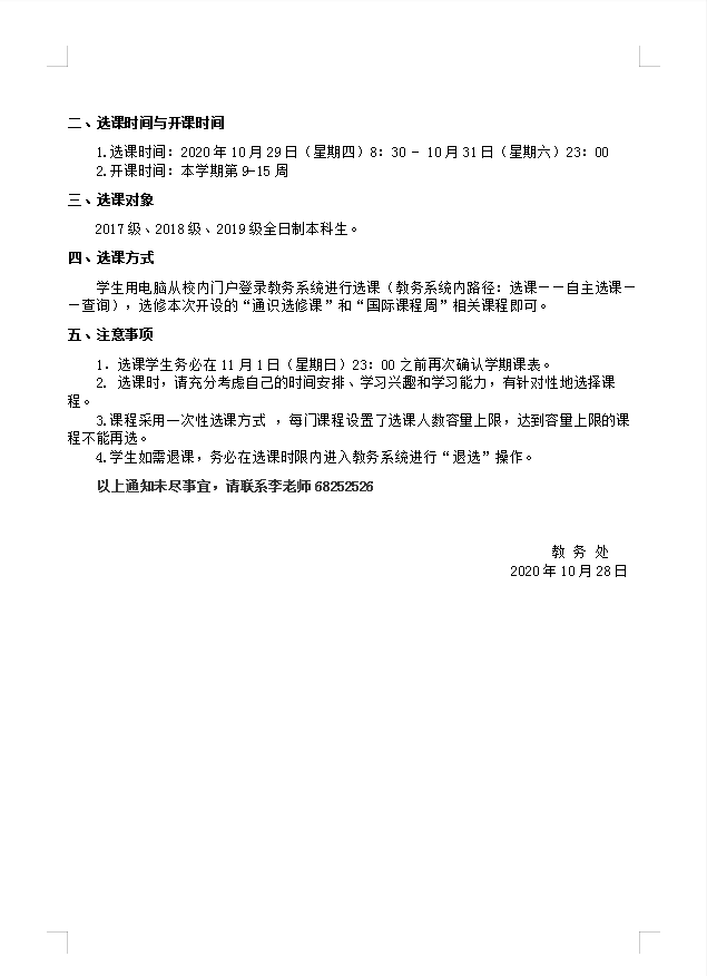 关于开展本学期增开“通识选修课”和“国际课程周”课程选课的通知