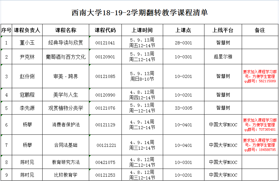 3.本学期部分网络课程实行翻转教学(即线上线下混合式教学),翻转课程线上教学部分均在相应平台授课,线下教学时间请见下图,选择翻转课程的同学务必准时参加线下教学,并牢记课程修读及考核要求。