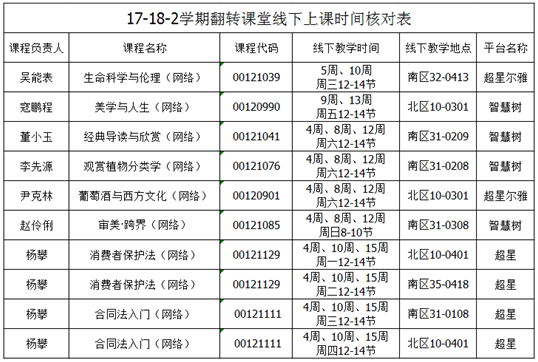 3.本学期部分网络课程实行翻转教学(即线上线下混合式教学),翻转课程线上教学部分均在相应平台授课,线下教学时间请见下图,选择翻转课程的同学务必准时参加线下教学,并牢记课程修读及考核要求。
