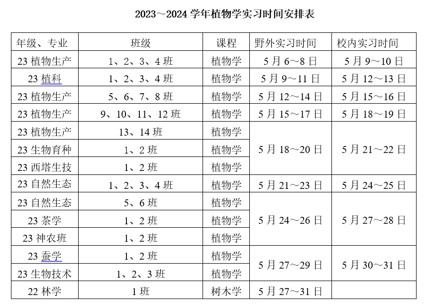 植物学实习共分为两个部分,包括缙云山野外实习14.4课时(3天),校园及室内实习9.6课时(2天),总共实习课时24课时(5天)。其中,2022年级林学进行植物学实习和树木学实习,实习时间5天。各专业具体的教学实习时间及地点安排见下表: