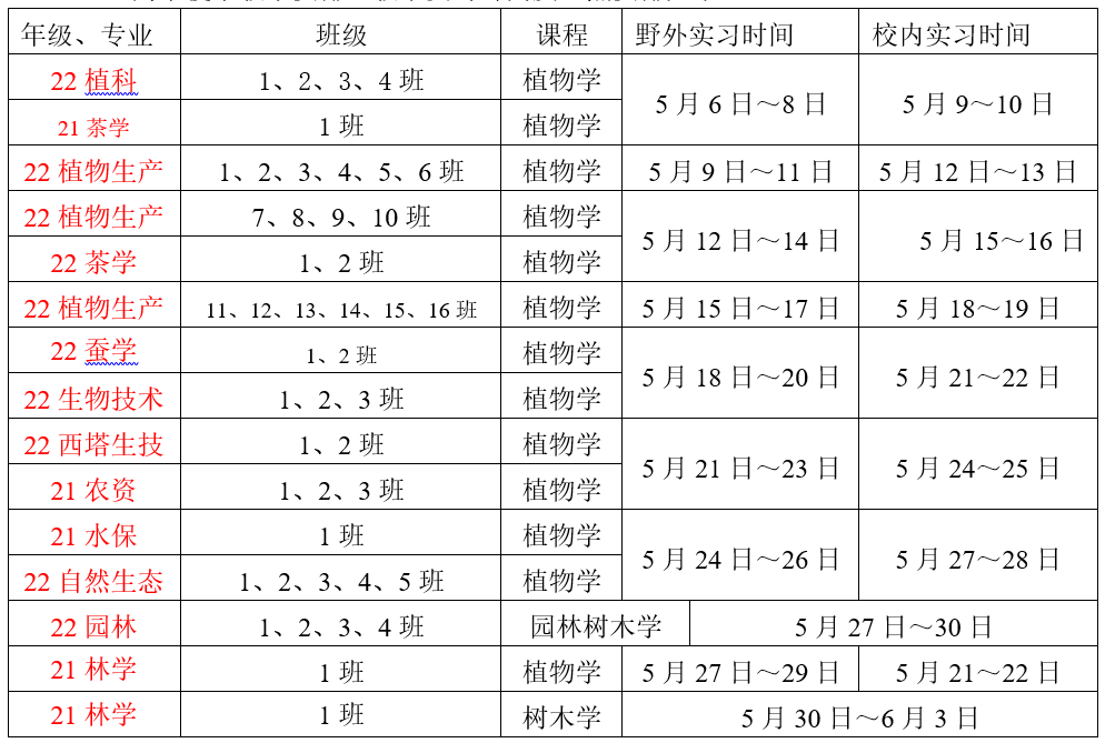 根据教学任务通知书,2022~2023学年第一学期应进行植物学教学实习共33个班级,实习时间1周,24个课时;2022~2023学年第二学期应进行植物学教学实习,7个班级,实习时间1周,24个课时;2022级风景园林1-4班应进行园林树木学实习,4个班级,实习时间1周,24课时;2021年级林学除进行植物学实习外还应进行树木学教学实习,1个班级,实习时间1周,24课时。