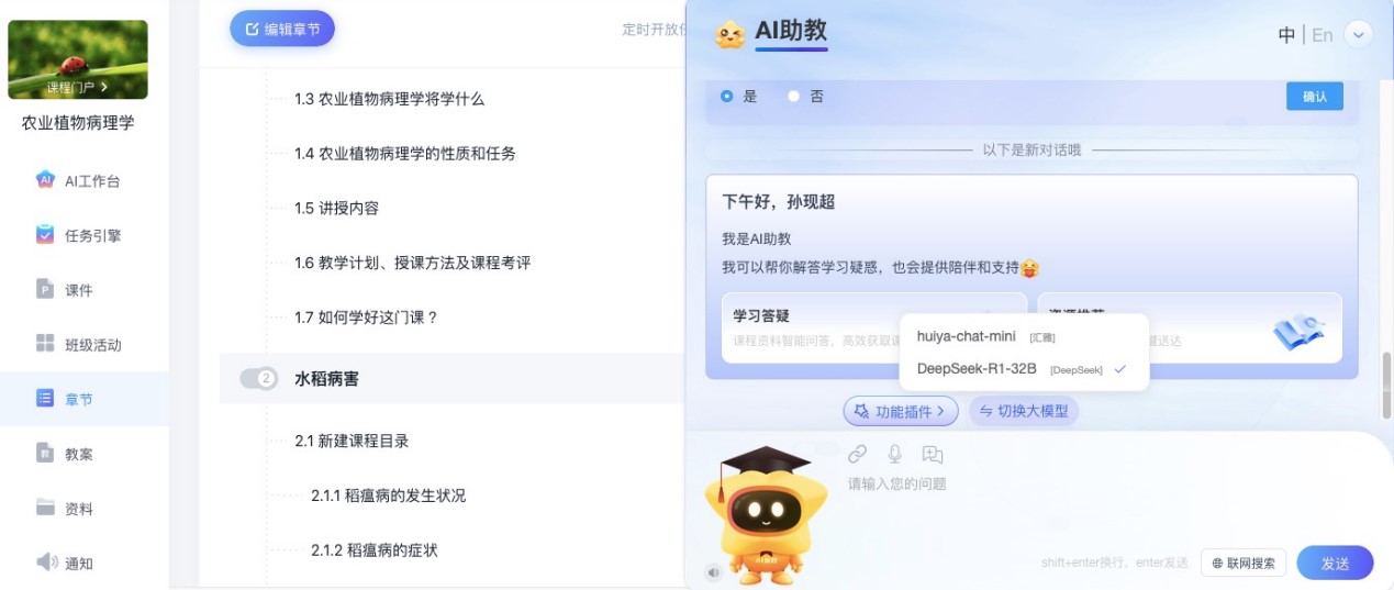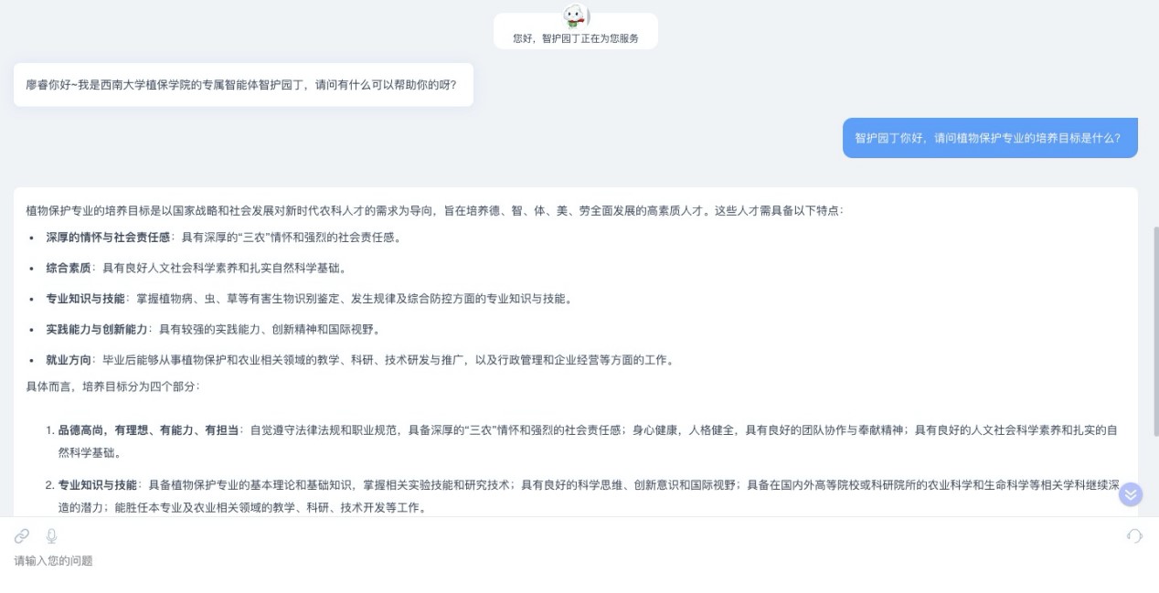 在此基础上,构建植物保护专业专属AI智能体“智护园丁”,形成植保专属知识库与垂类大模型,为教学注入新活力。