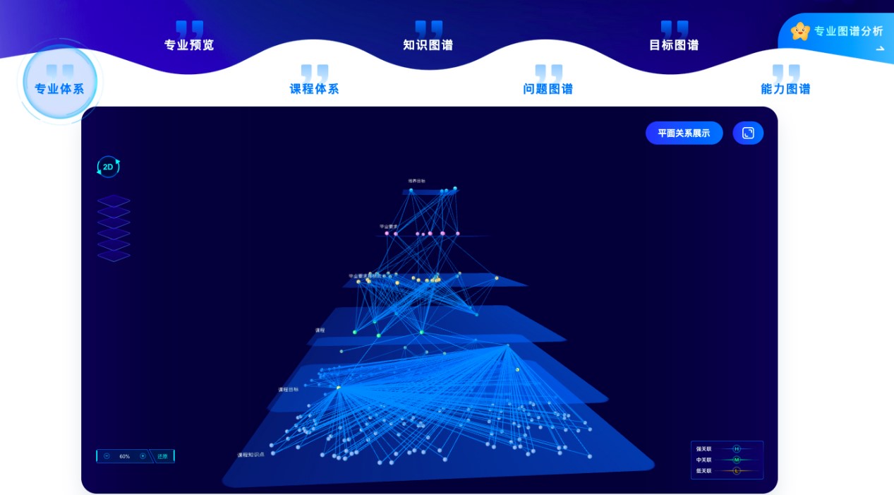 通过建设专业图谱-智慧课程群,旨在以全面展示、深度分析和科学管理为核心,集成专业图谱分析、专业体系、课程体系及监控模块,包括以毕业要求-课程目标为主线,通过知识图谱形成专业的知识点脉络,建立课程知识点与知识点之间的关系及跨课程知识点之间的关系,帮助学生构建专业课程整体思维体系。