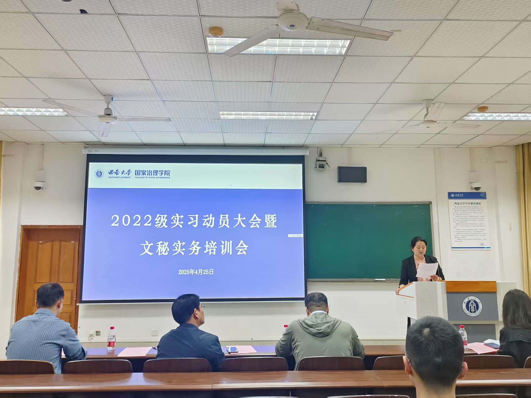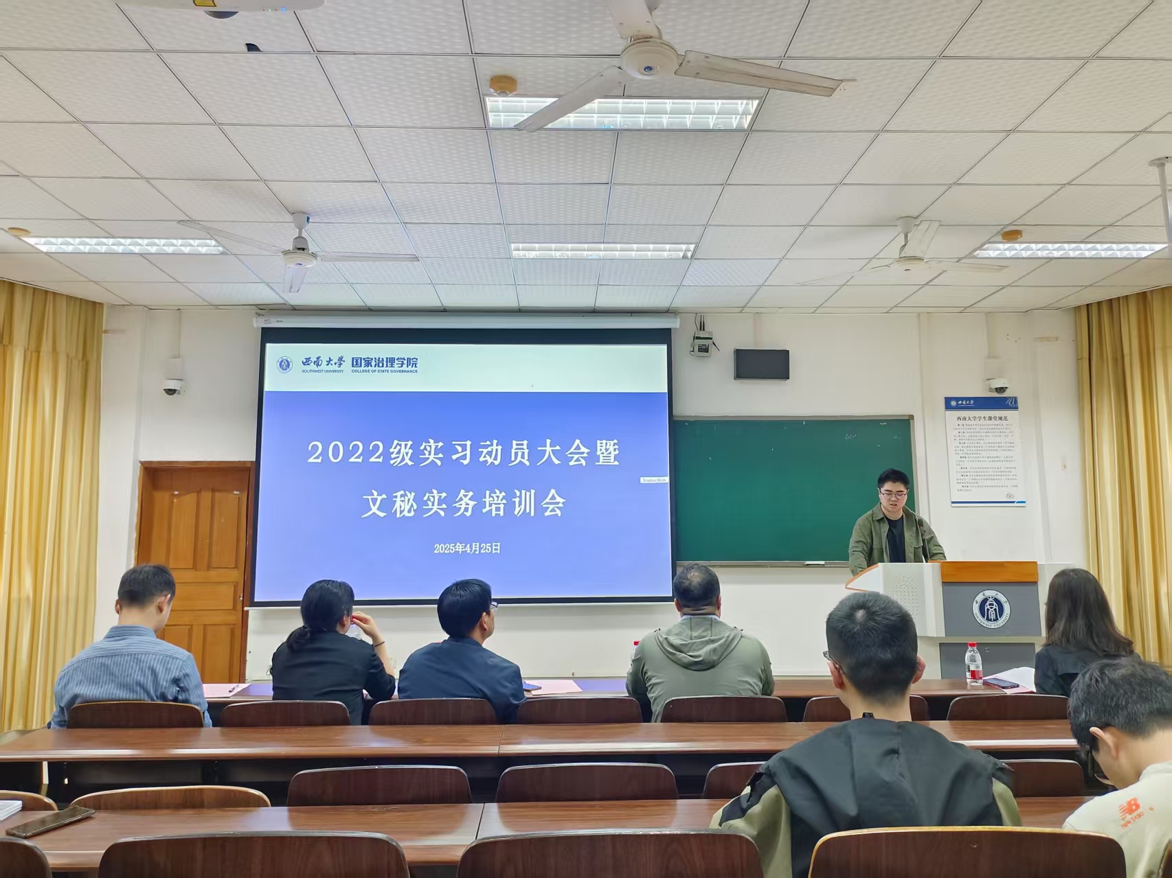 为进一步提升学生综合素养,强化学生职场适应能力,4月25日14:30,国家治理学院本科2022级于28教105教室开展了实习动员大会暨“如何做好文秘工作”实习前实务培训会。大会特邀重庆市北碚区天生街道党工委书记王加维、PA视讯教师教学发展中心主任田晓伟、国家治理学院副院长(主持工作)郭美云等嘉宾出席,学院2022级全体本科生参加会议。会议由学院党委副书记陈丽华主持。