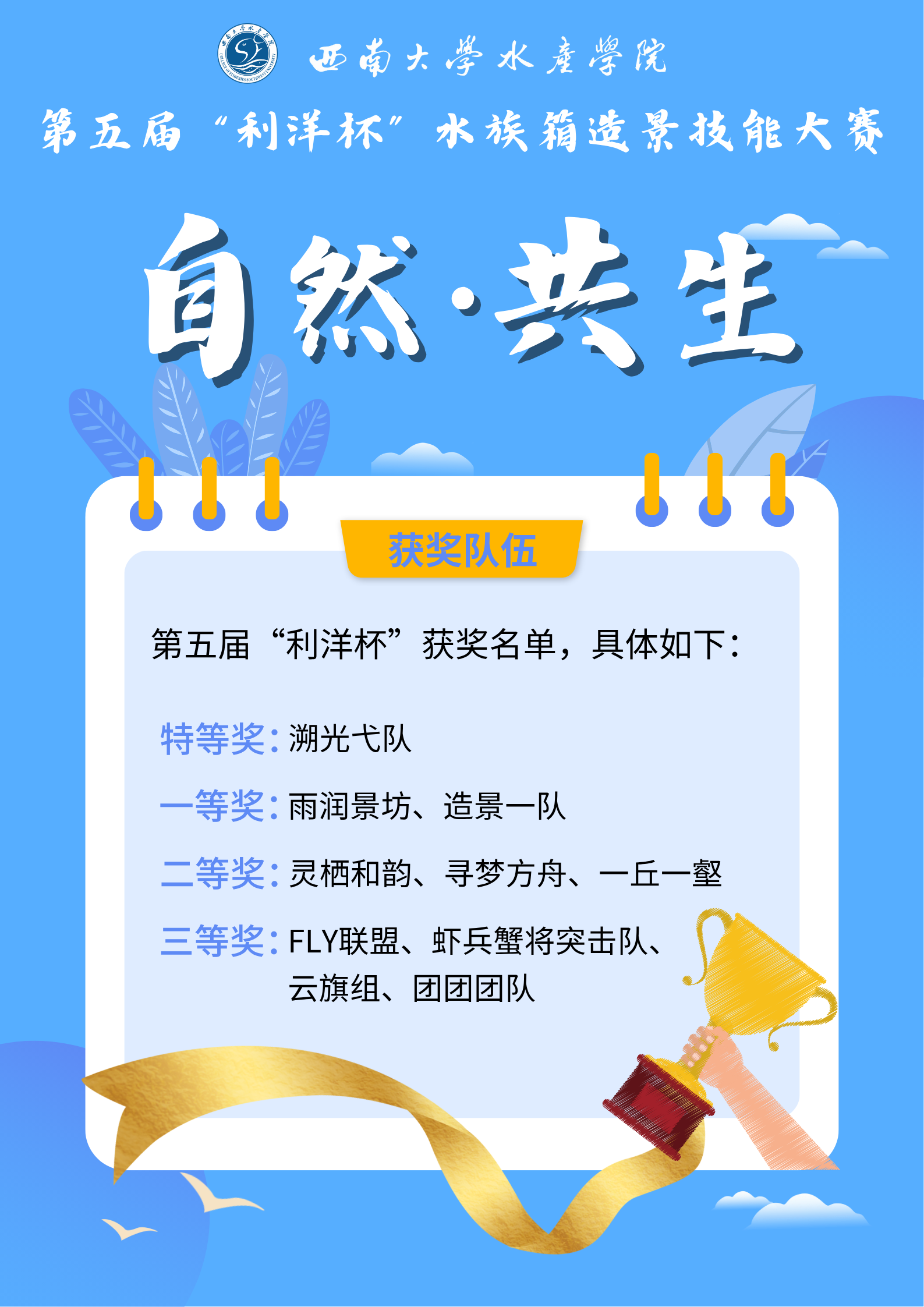18日上午10时30分,第五届“利洋杯”水族箱造景技能大赛闭幕式暨颁奖典礼在7B101举行,10支队伍脱颖而出,评出特等奖1项、一等奖2项,二等奖3项,三等奖4项。