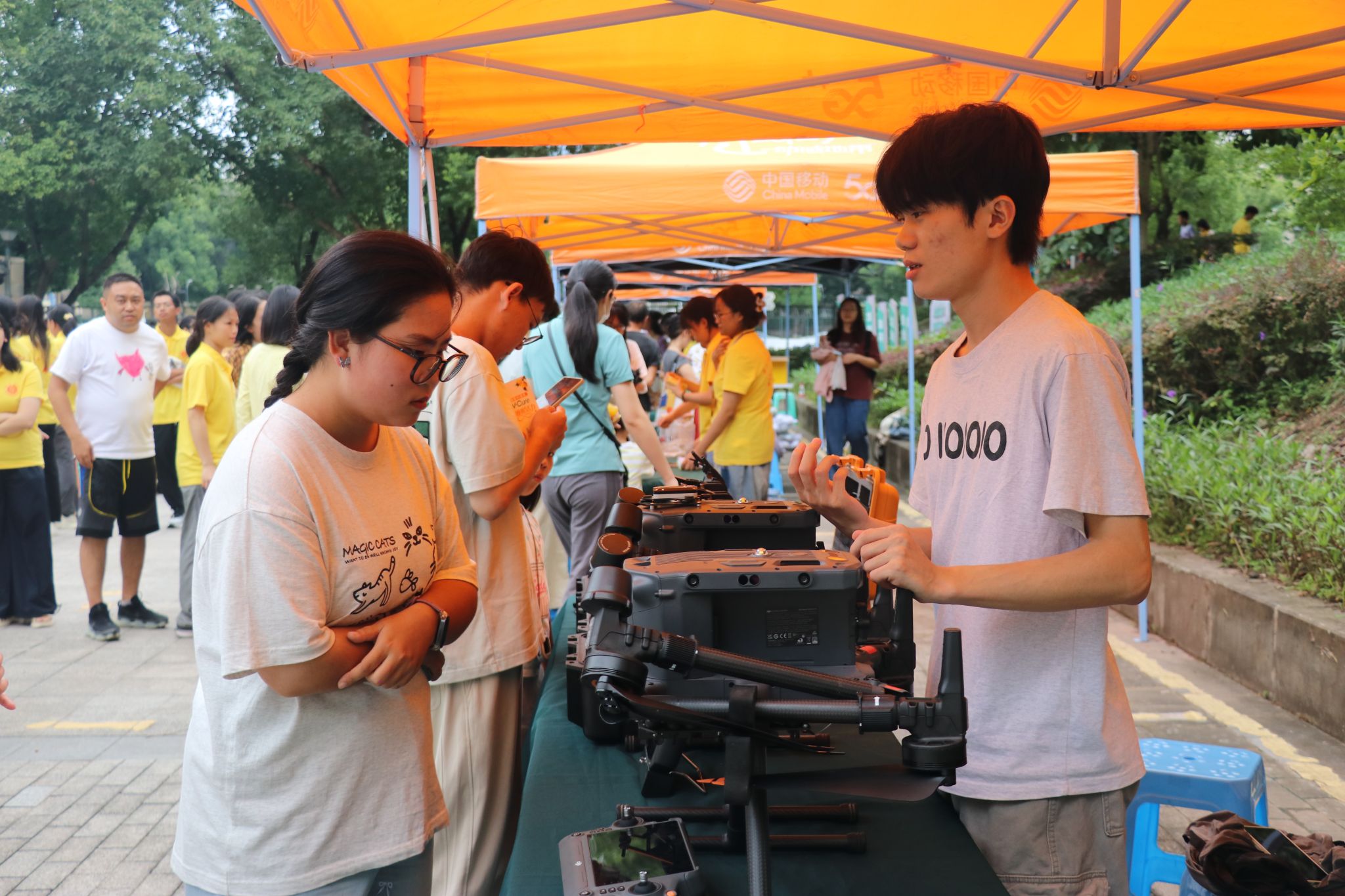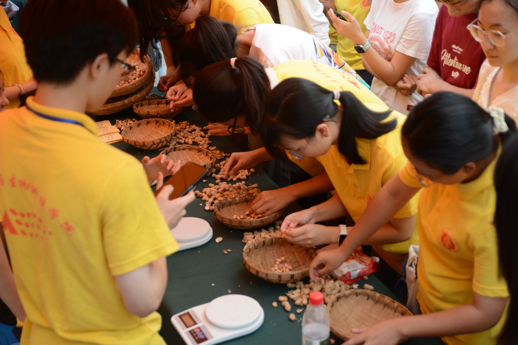 本届丰收节特别设置了农业展览区,包括“五谷丰登” 农产品品尝区、“大有可为”高科技农产品展区、“振兴乡村”特色农产品展销区等等,充分展现了我院科研发展的丰硕成果以及国家乡村振兴的美好前景。在“大有可为”展区,学院各个科研团队纷纷展示并介绍各自的优秀科研成果和产品,如高油酸菜籽油、新品种大米、高粱酒等新型品种以及转化生产的农副产品,彰显我院农业科学研究的丰收成果;在“五谷丰登”展区,有蒸熟的南瓜、红薯、爆米花、毛豆、荞麦茶等食品供师生免费品尝;在“振兴乡村”特色农产品展销区,来自彭水的小米花生、粉丝、苏麻和来自贵州龙里的刺梨等农产品现场展示品尝,并预留网购渠道供广大师生选购。