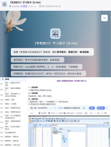 智能助学:做自主学习的 “可靠伙伴”。过去学生常遇到有问题无法及时获得准确解答的情况,现在通过绑定微信公众号的学生端智能体,随时随地都能找到学习“帮手”。当学生深夜梳理实验报告时卡在数据计算,它会分步拆解标准差求解逻辑;当复习时遗忘假设检验步骤,它会推送定制化复习资源并搭配例题解析。这种 “随时可问、不怕重复” 的支持模式,消解了学生提问的顾虑,让自主学习过程中的困惑及时得到解答,为他们增添了 “踏实感”,也有效降低了对难点知识的畏难情绪。