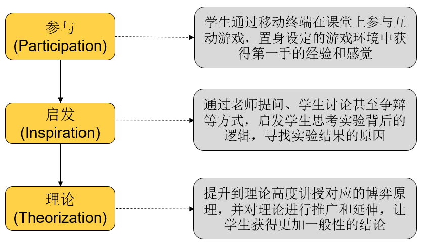 同时,我摸索形成 “参与—启发—理论”(PIT)的课堂行为实验体验式教学方法,并持续优化。实践证明,课堂游戏虽能吸引注意力,但要讲好课,关键在于实验后的引导设计。若游戏结束直接讲解理论,效果并不理想,必须预留启发思考环节:借助学生刚完成决策的体验,通过老师提问、学生讨论甚至争辩的方式,让学生自己把理论的本质思想讲出来,再由我讲解理论的数学符号化表达,此时学生最容易理解和接受。同时,老师还可以对理论进行扩展和延伸,让学生获得更加一般性的结论。