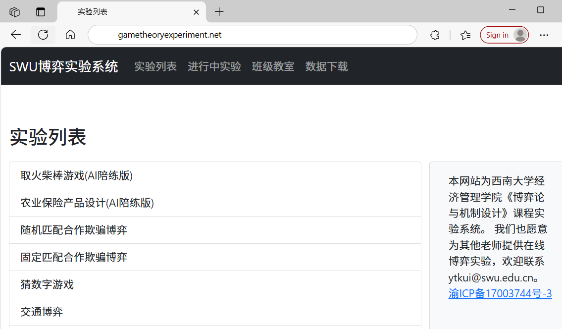 课堂实验的良好反馈,激励我开发更多适配课程的课堂游戏。经过多年积累,我已打造 50 余个博弈游戏,覆盖博弈论课程全部章节,能完整支撑理论教学体系。为实现实验在线化开展,我们购置腾讯云服务器,申请备案域名(http://www.gametheoryexperiment.net ),将博弈实验系统部署至云端。