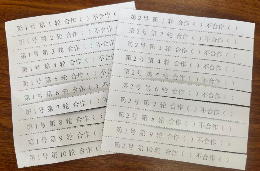 刚走上讲台时,我便发现经济学理论与生活常识的 “反差” 常让学生产生困惑。经济学研究对象就是包括坐在教室里上课的学生在内的“人”的行为,一个自然的疑问就是,如果让我们的学生参与到理论所设置的场景中,他们真的会像理论预测的那样做出决策吗?尤其是当有些理论乍一看与同学们的生活常识相背离时(例如博弈中囚徒困境模型的理论结果是双方都不合作,而在现实社会中多数人都是倾向于要合作),学生就会从内心对理论有所怀疑,从而影响学生学习的积极性。这就迫切需要能够让学生参与到跟理论模型完全一致的实验场景中,让他们自己“玩”出理论的结果。在当时没有数字化手段的情况下,我们就尝试采用原始的“纸笔实验”办法,事先设计并打印好实验便签,剪好了发给同学们填写他们的策略,然后收集上来匹配交互对手,计算并反馈他们的收益,然后请他们继续填写策略。当学生亲身参与多轮游戏之后,发现群体博弈的结果果然跟理论预测一致。大家才会真的相信理论,觉得所学知识是有用的,也提高了学习兴趣。纸笔实验虽然能够勉强开展,但效率非常低,需要填写、收集、计算、反馈等环节,一个简单的游戏就要持续一两节课。如何有效提升课堂效率?成了一个亟待解决的问题。